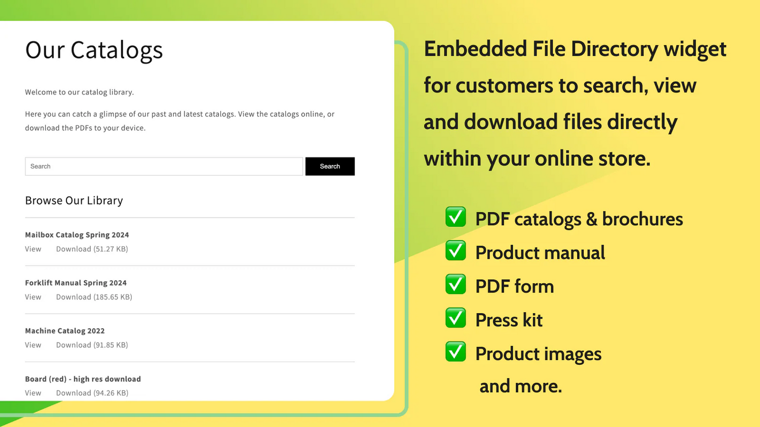 Download Page File Search MP lets for Shopify websites to share files like catalog, product manual and more with your end customers.