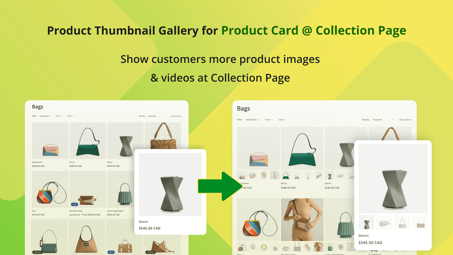 Collection Gallery Preview lets Shopify websites turn your product listing (product card) at Collection page into a mini carousel gallery.